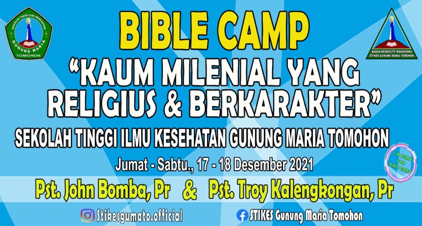 Kegiatan pembimbingan rohani dan pengembangan karakter mahasiswa merupakan salah satu kegiatan kemahasiswaan yang sangat penting di lingkungan kampus STIKES Gunung Maria Tomohon. Kegiatan ini rutin dilaksanakan setiap tahunnya. Tahun 2021 ini, kegiatan pembinaan rohani dan karakter ini diselenggarakan dalam kegiatan berupa Bible Camp yang mengangkat tema “Kaum Milenial yang Religius dan Berkarakter”.